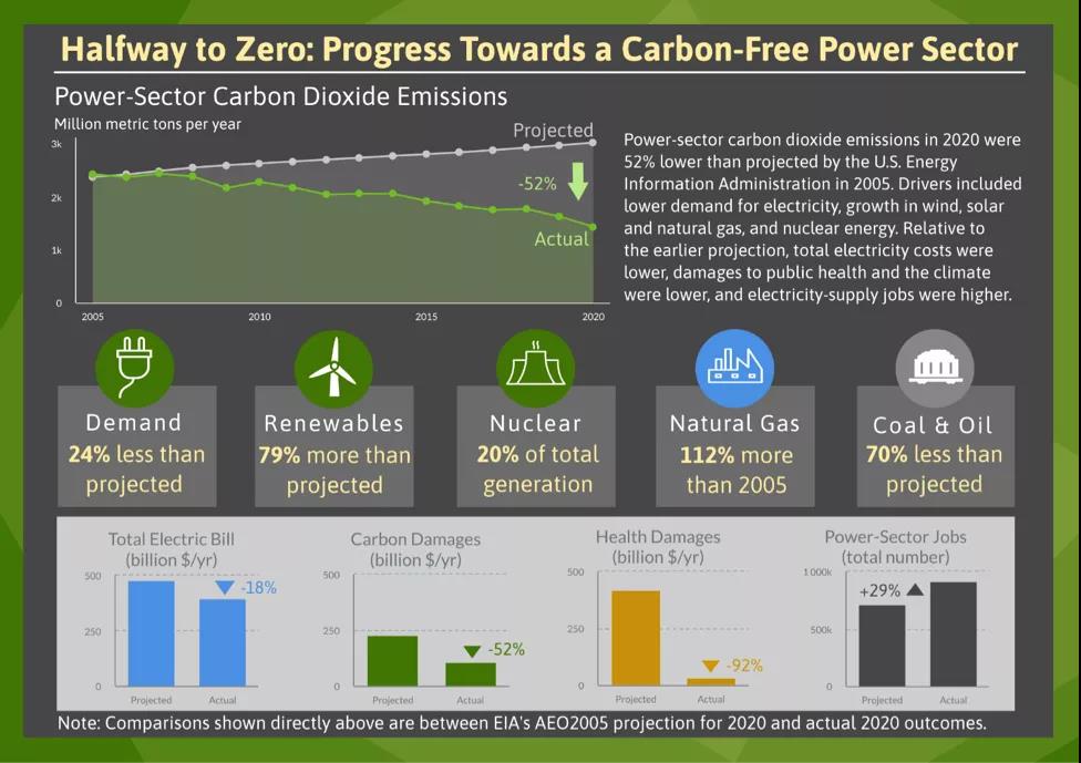 研究人員發現,風能和太陽能發電的表現大大超過預期,2020年的發電量是預期的13倍。這也是技術進步以及州和聯邦政策的結果,因為新的風能和太陽能技術價格大幅度下跌。研究發現,從煤炭轉向天然氣發電對降低碳排放起到了很大作用。在頁巖氣革命和天然氣低價的推動下,天然氣發電量迅速增長。