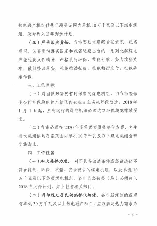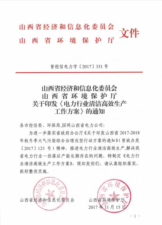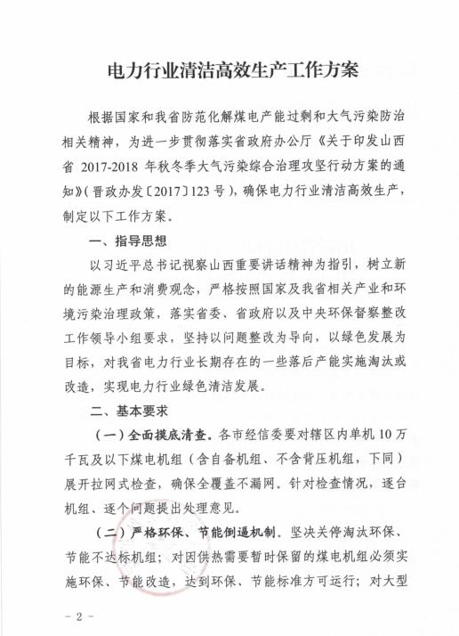 ??為進(jìn)一步落實(shí)省政府辦公廳《關(guān)于印發(fā)山西省2017-2018年秋冬季大氣污染綜合治理攻堅行動方案的通知》(晉政辦發(fā)〔2017〕123號)精神,推進(jìn)電力行業(yè)清潔高效生產(chǎn),解決我省電力行業(yè)一些落后產(chǎn)能長期存在的問題,特制定《電力行業(yè)清潔高效生產(chǎn)工作方案》,現(xiàn)印發(fā)你們,請認(rèn)真組織落實(shí),抓好整改實(shí)施。