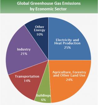 發電(25%),交通(14%),工業部門(21%)和建筑(6%是碳排放的4個主要來源。