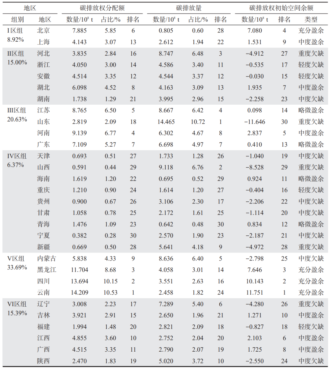 表1? 2017年我國30個省級行政區碳排放量、碳排放權分配額及其初始余額