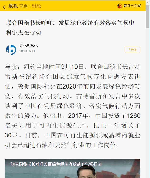 導(dǎo)讀:紐約當(dāng)?shù)貢r(shí)間9月10日,聯(lián)合國(guó)秘書(shū)長(zhǎng)古特雷斯在紐約聯(lián)合國(guó)總部就氣候變化問(wèn)題發(fā)表講話,敦促國(guó)際社會(huì)在2020年前向發(fā)展綠色經(jīng)濟(jì)轉(zhuǎn)變,有效落實(shí)氣候行動(dòng)。古特雷斯在發(fā)言中多次談到了中國(guó)在發(fā)展綠色經(jīng)濟(jì)、落實(shí)氣候行動(dòng)方面做出的努力。他指出,2017年,中國(guó)投資了1260億美元用于可再生能源生產(chǎn),比上一年增長(zhǎng)了30%。目前,中國(guó)在可再生能源領(lǐng)域新增的就業(yè)機(jī)會(huì)已超過(guò)石油和天然氣行業(yè)的工作崗位。