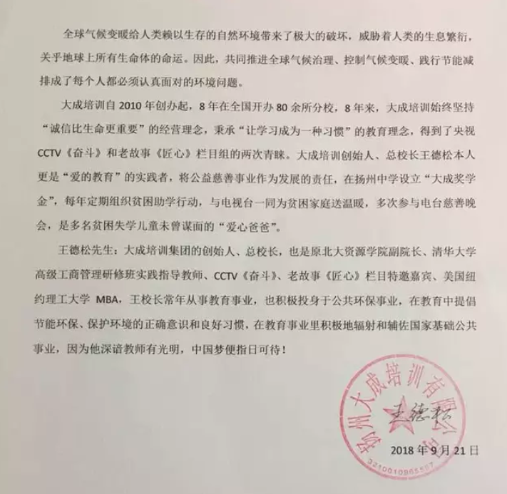 王德松先生:大成培訓(xùn)集團(tuán)的創(chuàng)始人、總校長(zhǎng),也是原北大資源學(xué)院副院長(zhǎng)、清華大學(xué)高級(jí)工商管理研修班實(shí)踐指導(dǎo)教師、CCTV《奮斗》、老故事《匠心》欄目特邀嘉賓、美國(guó)紐約理工大學(xué)MBA。王校長(zhǎng)常年從事教育事業(yè),也積極投身于公共環(huán)保事業(yè),他常常教導(dǎo)學(xué)生要注意節(jié)能環(huán)保、要保護(hù)我們生存環(huán)境。他在教育事業(yè)里積極地輻射和輔佐國(guó)家基礎(chǔ)公共事業(yè),因?yàn)樗钪O教師有光明,中國(guó)夢(mèng)便指日可待!